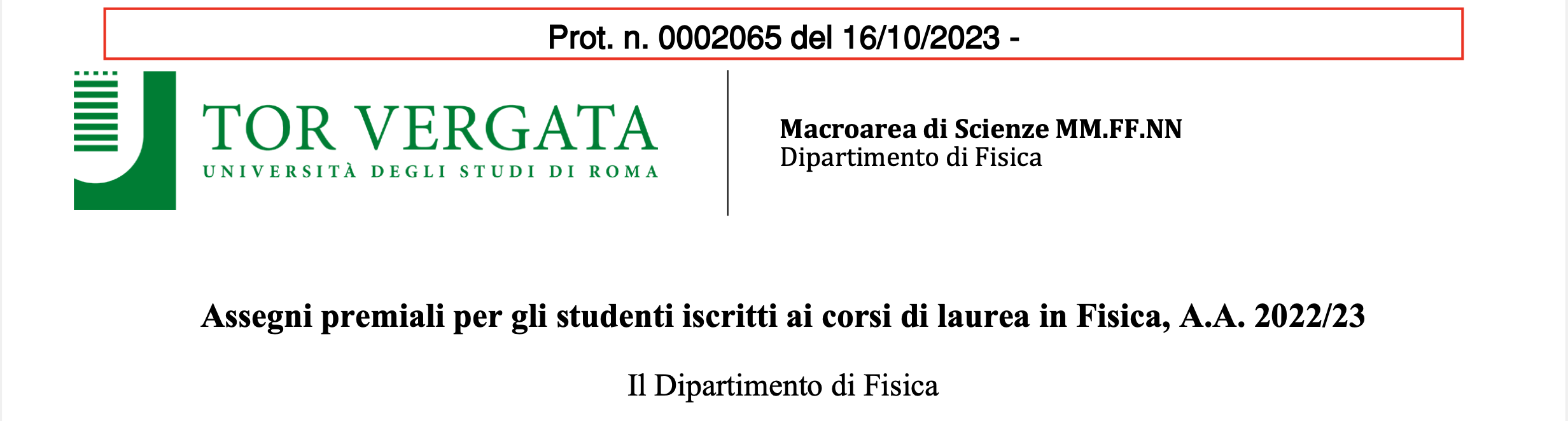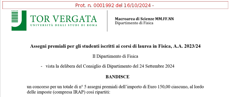 Bando per assegni premiali per gli studenti iscritti ai corsi di Laurea in Fisica, A.A. 2022/23