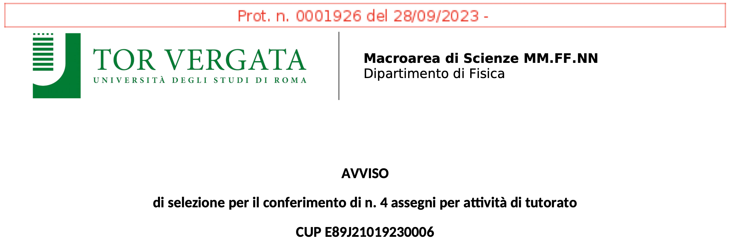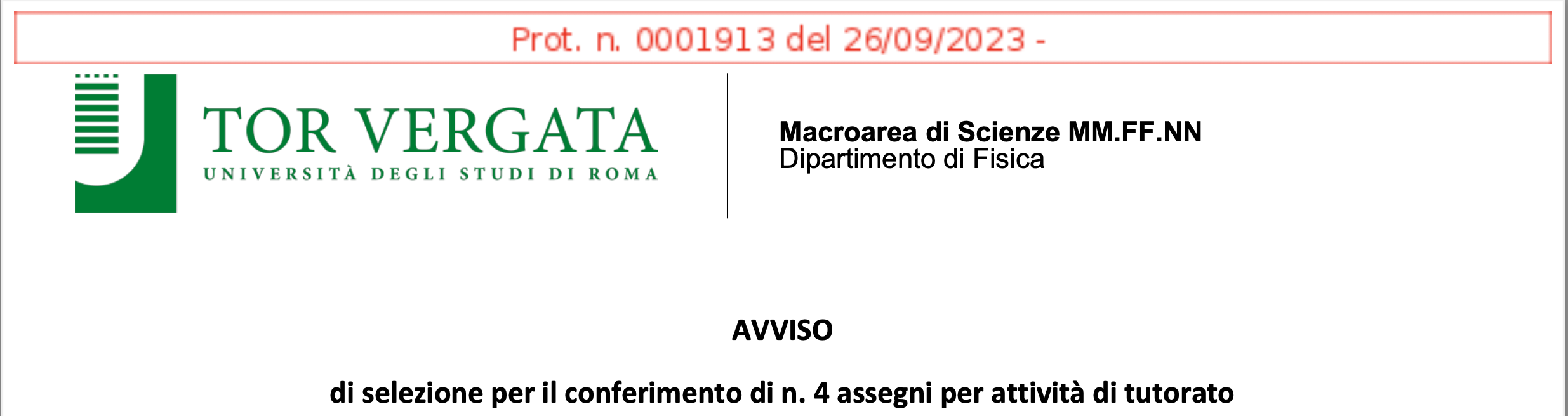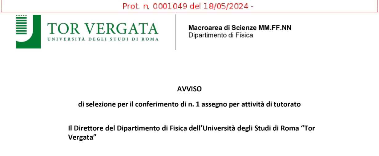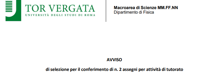AVVISO di selezione per il conferimento di n. 4 assegni per attività di tutorato Il Direttore del Dipartimento di Fisica dell’Università degli Studi di Roma “Tor Vergata” Corso di Laurea Triennale in Fisica, (L-30 R)