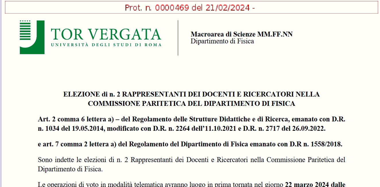 ELEZIONI DI N. 2 RAPPRESENTANTI DEI DOCENTI E RICERCATORI NELLA COMMISSIONE PARTITETICA DEL DIPARTIMENTO DI FISICA