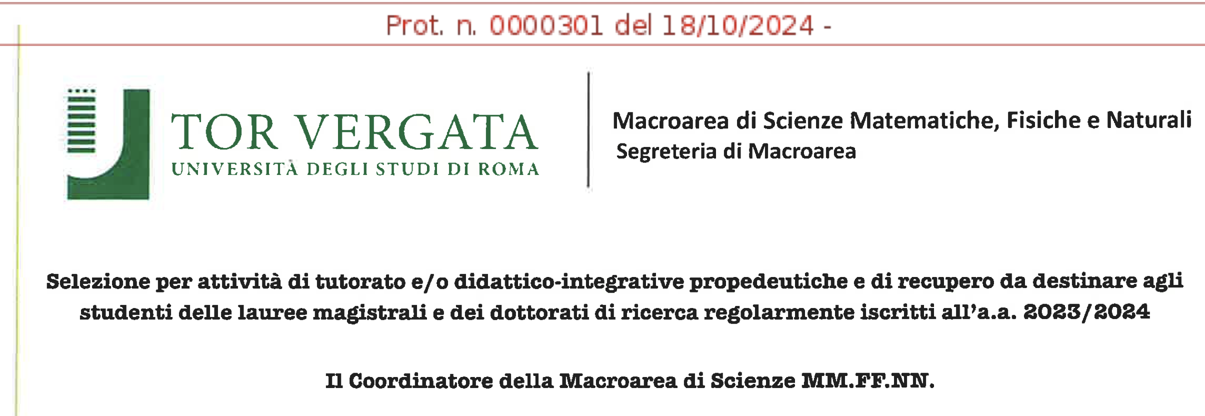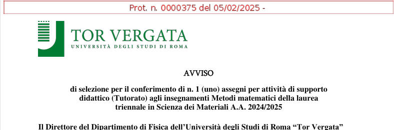AVVISO di selezione per il conferimento di n. 1 (uno) assegni per attività di supporto didattico (Tutorato) agli insegnamenti Metodi matematici della laurea triennale in Scienza dei Materiali A.A. 2024/2025