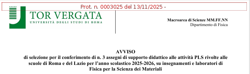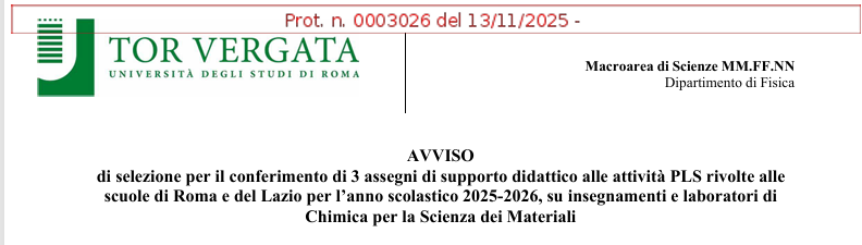 Bando per il conferimento di n. 1 assegno per attività̀ di supporto didattico (Tutorato) all’insegnamento del primo semestre A.A. 2023/2024 - PLS Scienza dei Materiali