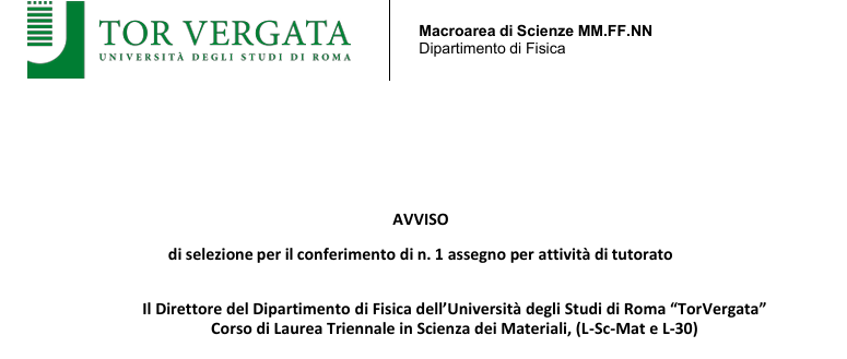 AVVISO di selezione per il conferimento di n. 1 assegno per attività di tutorato Il Direttore del Dipartimento di Fisica dell’Università degli Studi di Roma “Tor Vergata” Corso di Laurea Triennale in Scienza dei Materiali, (L-Sc-Mat e L-30)