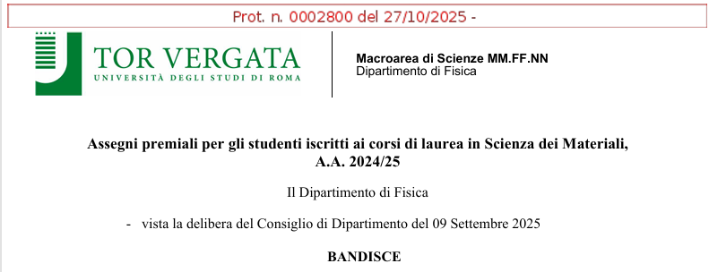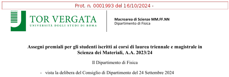Assegni premiali per gli studenti iscritti ai corsi di laurea triennale e magistrale in Scienza dei Materiali, A.A. 2023/24