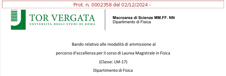 Bando relativo alle modalità di ammissione al percorso d’eccellenza per il corso di laurea in Fisica (Classe: LM-17) a.a. 2024/2025