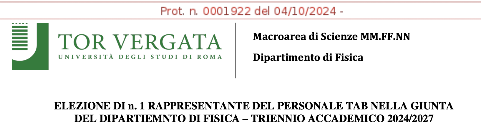 ELEZIONE DI n. 1 RAPPRESENTANTE DEL PERSONALE TAB NELLA GIUNTA DEL DIPARTIMENTO DI FISICA – TRIENNIO ACCADEMICO 2024/2027