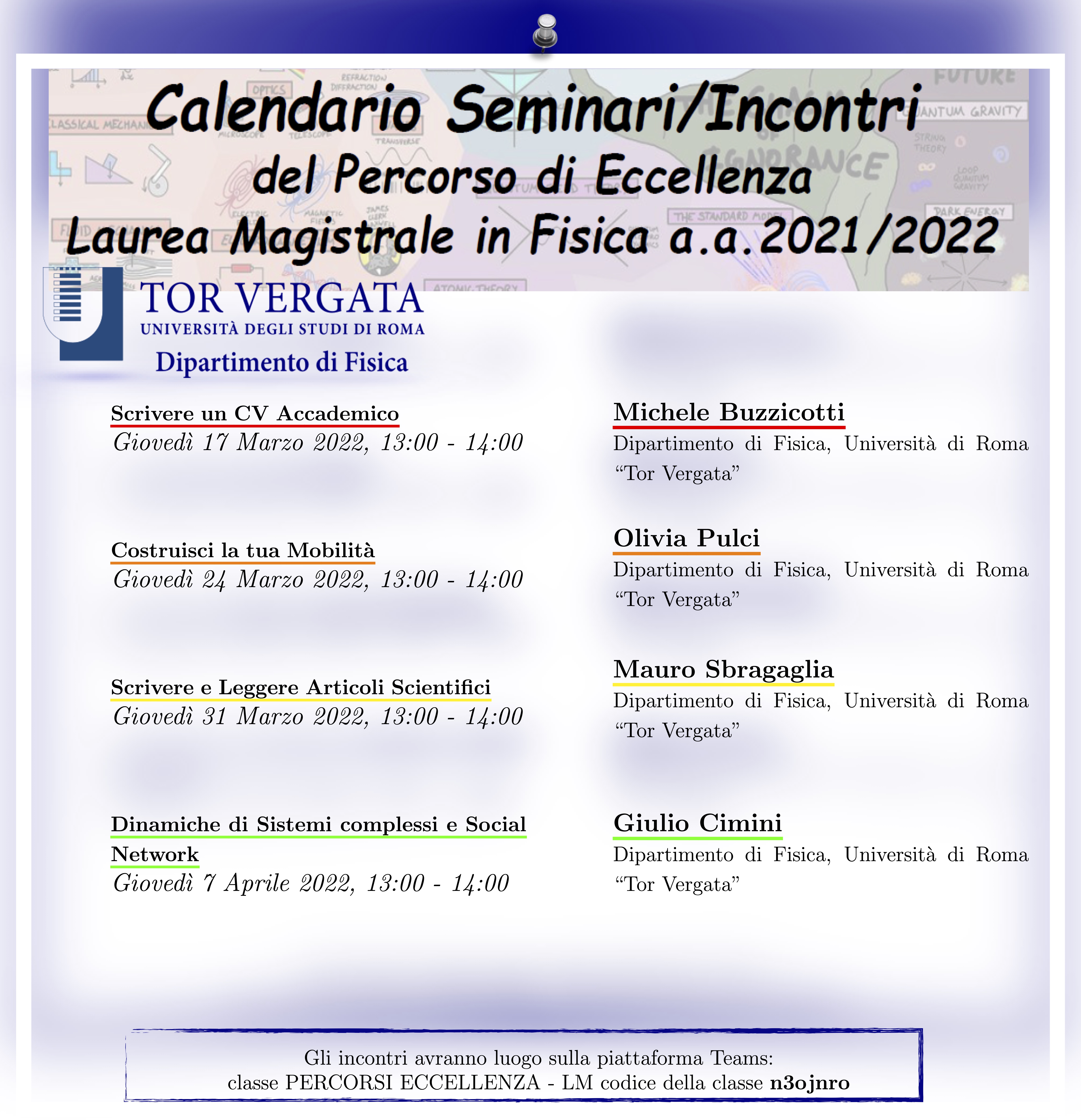 Calendario Seminari e Incontri Percorso di Eccellenza della Laurea Magistrale in Fisica a.a. 2023/2024