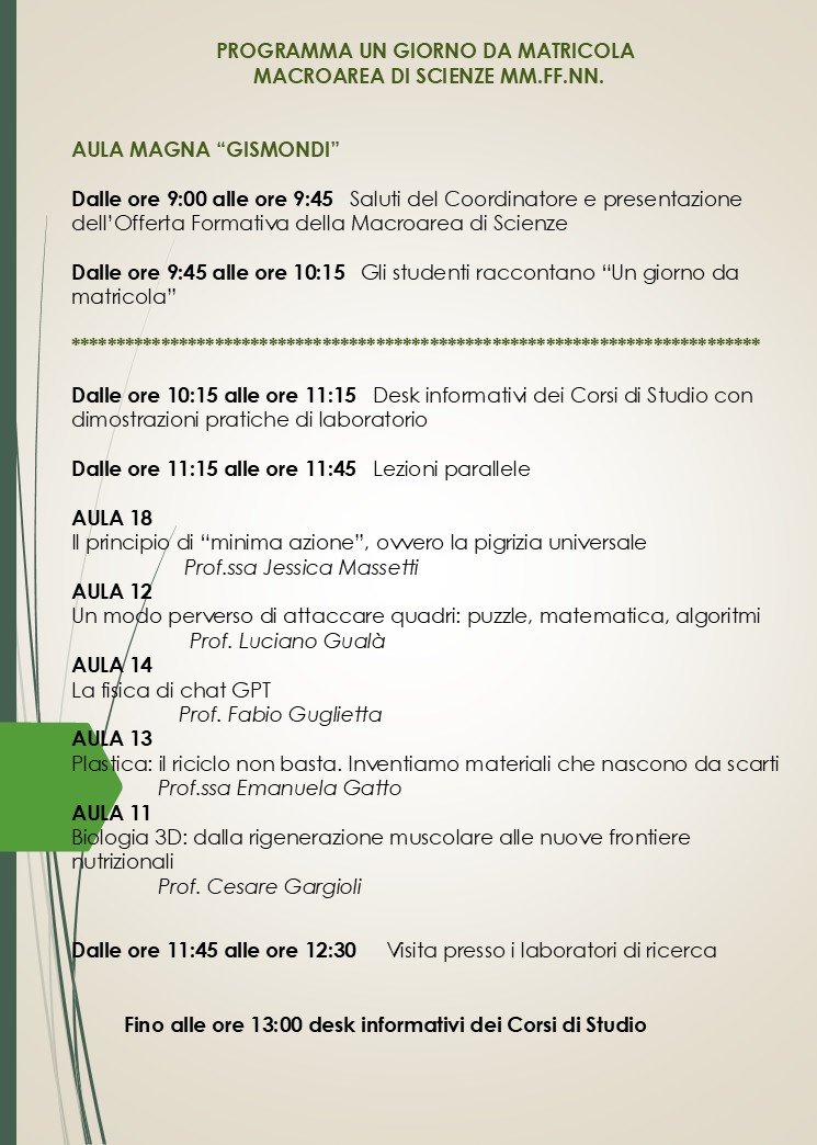 Venerdì 16 Gennaio, la Macroarea di Scienze MM.FF.NN. organizza l’iniziativa “Un giorno da matricola”, un evento di orientamento dedicato a studentesse e studenti interessati ai Corsi di Studio dell’area scientifica.